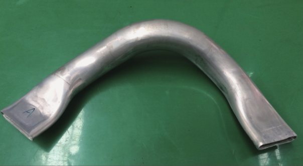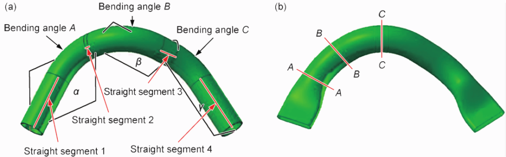 而Li等研究人員則通過數值模擬及實驗研究了6061-T4鋁合金管材冷彎時的回彈角、回彈半徑與彎角的影響;證實了回彈角隨著彎角增加而線性增加,回彈半徑隨著彎角增加在0°~90°時線性減小,在90°~180°隨著彎角增加基本不發生變化;并利用各向異性硬化模型對回彈角進行了預測,其預測值略高于實驗值,最大相差1.67%。在CNC彎曲時,截面畸變也是比較容易出現的典型缺陷。在多步成形中,截面畸變直接影響后續成形的預制坯形狀,從而影響最終件的成形質量。