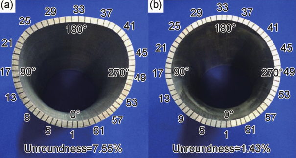 管材在彎曲時,在彎矩的作用下,中性層外側受到拉應力,內側受到壓應力,二者的合力使管件法向直徑減小,橫向直徑增大,管件截面由圓形變為近似橢圓,即發生畸變。在管徑、彎曲半徑及潤滑條件不變的情況下,通過不帶芯頭的聚氨酯芯棒和帶有一個芯頭的剛性芯棒分別進行CNC彎曲,得到了2種具有不同不圓度的截面,如圖C所示。其中聚氨酯芯棒的好處是可以使管件內部避免劃痕,但得到的彎管截面不圓度較大;帶有一個芯頭的剛性芯棒的好處是得到的彎管截面不圓度較小,但與管件內部發生硬接觸,容易在彎曲過程產生內部劃痕。