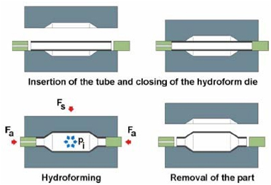 內(nèi)高壓成形原理是通過內(nèi)部加壓和軸向加力補(bǔ)料把管坯壓入到模具型腔使其成形,成形時(shí)內(nèi)壓和軸向進(jìn)給按事先給定的匹配關(guān)系,由計(jì)算機(jī)精確控制。