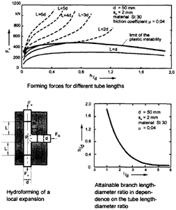 德國 Paderborn 大學(xué)的 F.dohmann? 等人經(jīng)過研究后指出:由于摩擦的影響,在成形過程中軸向力總會有所損失。在 T 型三通管內(nèi)高壓成形補(bǔ)料的過程中,當(dāng)水平?jīng)_頭的軸向推力超過一個(gè)臨界水平,壓縮失穩(wěn)就會在管坯不規(guī)則的壓縮變形處產(chǎn)生。他們給出了一個(gè)實(shí)例來說明補(bǔ)料段管長對可獲得的枝管高度的影響,如圖 1-10。經(jīng)過理論的推導(dǎo)計(jì)算,得到了出現(xiàn)失穩(wěn)狀態(tài)的判據(jù)。