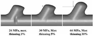 意大利Palermo大學(xué)的N. Alberti,L. Fratini對材料是AISI1015鋼,壁厚為1mm的T型三通管進(jìn)行了有無反推沖頭的數(shù)值模擬研究。研究結(jié)果表明采用反推沖頭后三通管減薄更小,壁厚更均勻。
