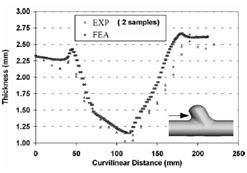 美國俄亥俄州立大學(xué)的學(xué)者對 Y 型三通管內(nèi)高壓成形進(jìn)行了深入的研究。他們討論了如何對內(nèi)高壓成形 Y 型三通管的工藝參數(shù)進(jìn)行估算,這些參數(shù)包括成形壓力、軸向補(bǔ)料量、原始管坯長度,給出了一些計(jì)算公式。然后通過 FEA 模擬對估算的工藝參數(shù)進(jìn)行優(yōu)化,確定了合適的加載路徑,用外徑為 50.5mm, 壁厚為 1.5mm 的管坯進(jìn)行了實(shí)驗(yàn),并在德國 Aalen 的 SPS 研究中心成形出了枝杈夾角為 60°的 Y 型三通管,如圖 1-14。成形零件的壁厚分布和模擬得到的壁厚分布吻合比較好,如圖 1-15。通過實(shí)驗(yàn),還研究了在沒有反推沖頭作用時(shí)管坯長度對枝管高度的影響,結(jié)果表明在軸向進(jìn)給量相同的情況下,管坯長度越小,脹起的枝杈高度越大。