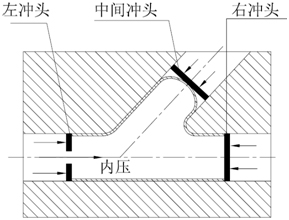 成形過程為在一定內(nèi)壓下,左右沖頭按與內(nèi)壓一定的匹配關(guān)系向內(nèi)補(bǔ)料;中間沖頭置于模具右側(cè)圓角與枝管的交界處,在成形的初期保持不動,等管坯貼上中間反推沖頭后,中間反推沖頭隨著枝管的長高向后退,后退時(shí)中間反推沖頭要對枝管施加一定的推力。