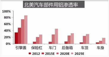鋁合金具有低密度、可再生、良好的工藝性、抗沖擊性能好、耐腐蝕等諸多優(yōu)點(diǎn)。已經(jīng)成為僅次于鋼材的汽車用金屬材料,其目前在發(fā)動(dòng)機(jī)缸體、活塞、變速箱殼體、進(jìn)氣支管、氣缸蓋、轎車骨架、車身、座椅支架、輪轂、熱交換器等領(lǐng)域應(yīng)用率較高。據(jù)預(yù)測(cè),到2025年,采用全鋁車身的車型占比達(dá)到30%,全球車身用鋁總量將達(dá)到870萬噸,車身用鋁行業(yè)將出現(xiàn)爆發(fā)式增長(zhǎng)。關(guān)于國(guó)內(nèi)以及北美市場(chǎng)汽車用鋁的預(yù)測(cè)如圖10和11所示,由圖可知國(guó)內(nèi)車身用鋁量年復(fù)合增長(zhǎng)率達(dá)45%,北美市場(chǎng)未來10年汽車零部件用鋁量也逐年明顯增加。