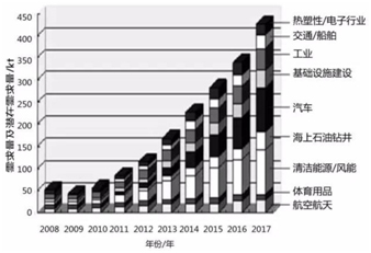 汽車領(lǐng)域是復(fù)合材料的最大市場(chǎng),大約占其總體積的20%,銷售額的18%,世界上平均每輛乘用車,復(fù)合材料約占總重量的6%,而全球碳纖維的潛在需求量預(yù)測(cè)如圖14所示,在汽車行業(yè)的潛在需求量呈現(xiàn)明顯的逐年上升趨勢(shì)。