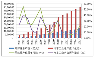圖2:2001年-2015年我國(guó)汽車和零部件產(chǎn)業(yè)總產(chǎn)值及增長(zhǎng)趨勢(shì)