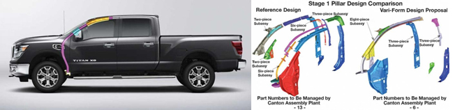 Nissan’s Titan采用液壓成形A柱,比傳統(tǒng)工藝減少了30個(gè)零件,減少了15.88kg,采用高強(qiáng)鋼,提高了汽車碰撞性能。