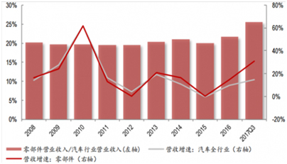 新一輪由自主崛起驅(qū)動(dòng)的國(guó)產(chǎn)替代,無論是在替代的廣度還是深度上,都有明顯提升,為零部件行業(yè)快速增長(zhǎng)提供更大助力。零部件行業(yè)收入一直保持快于汽車行業(yè)的增長(zhǎng),占汽車行業(yè)比重已由2008年的20%提升至2017年第三季度的25%,顯示在自主崛起,進(jìn)口替代的超強(qiáng)驅(qū)動(dòng)下,行業(yè)快速增長(zhǎng),行業(yè)地位顯著提升。