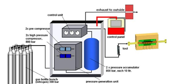 該成形技術(shù)早起主要集中在輕質(zhì)難變形合金的成形過程中,近些年來隨著高強(qiáng)鋼在汽車上用量的不斷增加,熱氣脹成形裝備不斷發(fā)展進(jìn)步,國(guó)外相關(guān)研究人員簡(jiǎn)歷的高壓氣脹成形設(shè)備如圖33所示。