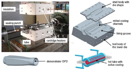 通過高壓氣體增壓器該設(shè)備最高可以獲得理論80MPa氣體壓力,最高成形溫度達(dá)1000℃,而且該裝置可以實(shí)現(xiàn)對(duì)高強(qiáng)鋼管材的快熟加熱、快速成形及淬火處理。先用感應(yīng)線圈將管材迅速加熱到奧氏體化溫度,保溫一段時(shí)間之后,迅速轉(zhuǎn)移到模具中,快速合模、密封、加壓脹形、淬火、脫模冷卻,脹形強(qiáng)化后掛彩局部強(qiáng)度可達(dá)1400~1600MPa。