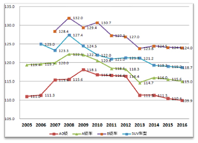 圖4:國(guó)內(nèi)市場(chǎng)乘用車輕量化趨勢(shì)(2005-2016)(5MT樣本基準(zhǔn))