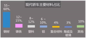 據(jù)統(tǒng)計(jì),如圖8所示,現(xiàn)代轎車中占自重90%的六類材料分別是鋼材(55~60%)、鑄鐵(12~15%)、塑料(8~12%)、鋁(6~10%)、復(fù)合材料(4%)、陶瓷及玻璃(3%)、其他(10%)。