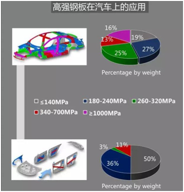 理論上,相對(duì)于傳統(tǒng)340MPa的材料,600MPa級(jí)鋼材的減重潛能約為20%,800MPa級(jí)鋼種的減重潛能可達(dá)30%以上,強(qiáng)度級(jí)別在1000MPa以上的鋼材在汽車上的比重已經(jīng)達(dá)到16%。