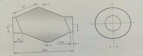 異形雙錐形管件的材料為1Cr18Ni9Ti,均勻延伸率45%,幾何形狀如圖2—41所示。管材直徑為56mm,壁厚為2.5mm。該件內(nèi)高壓成形有兩個(gè)難點(diǎn):