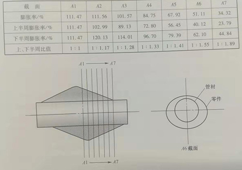 表2-6為該雙錐管件各截面的膨脹率,從中心開始每隔10mm取一個(gè)截面,各截面選取示意如圖2-42所示。從該表可知,在A5-47截面處,下半周膨張率遠(yuǎn)大于上半周膨脹率,表明此處變形非常不均勻;在A1-A4截面,下半周能脹率已經(jīng)超過材料均勻延伸率的2倍,容易在下半周產(chǎn)生開裂。