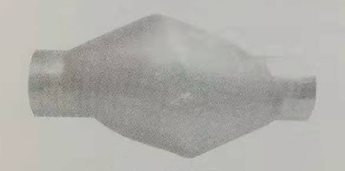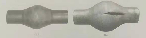 圖2-43(a)所示為用“有益皺紋“方法獲得的一個(gè)對稱的雙錐形預(yù)成形壞該件的最大膨脹率達(dá)到了78%,用該件作為預(yù)成形壞成形最終零件,雖然平均周向變形量已經(jīng)變小,并進(jìn)行了退火處理,由于在A5-47截面處變形不均勻還會(huì)導(dǎo)致開裂缺陷,見圖2-43(b)。為了獲得合格零件必須在雙錐形預(yù)成形壞的基礎(chǔ)上加工二次預(yù)成形坯,以克服塑性變形不均勻的困難。在采用合理的二次預(yù)成形坯后,獲得合格零件,如圖2-44所示。