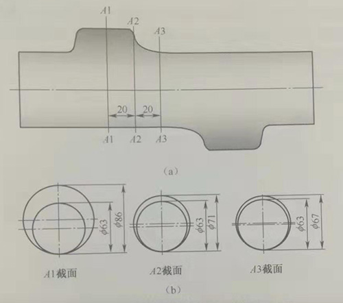 為了分析空心曲軸內(nèi)高壓成形的變形特點(diǎn),在曲軸上選取了A1、A2和A3個(gè)典型截面,每個(gè)截面相隔20mm,如圖2-45(a)所示。A1截面位于曲拐中間,A2截面位于曲拐與中間過渡段之間,A3截面位于兩個(gè)曲拐中間,三個(gè)截面的形狀如圖2-45(b)所示。