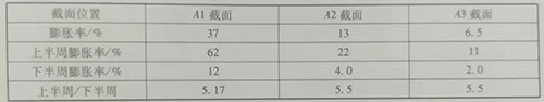 表2-7是三個(gè)截面膨脹率的計(jì)算結(jié)果。A1、A2、A3的膨脹率分別是37%、13%和6.5%,而上半周膨脹率分別是62%、22%和11下半周膨脹率分別是12%,4%和2%,三個(gè)截面的上半周膨脹率和下半周膨脹率之比分別為5.17、5.5和5.5。可見由管材到零件的成形過程中上、下半周的膨脹率相差很大,變形過程是非對稱的,其中最大變形截面A1截面的上、下半周的膨脹率相差5倍以上,尤其是上半周的膨脹率達(dá)到了62%,成形難度很大。