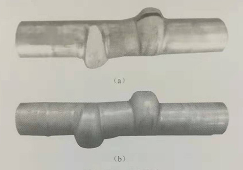 雖然中間毛坯到零件的平均變形量僅為27%,但仍然存在變形不均勻性A1截面上半周平均變形量為44%,A1截面下半周平均變形量為10%。采用中間管材,盡管經(jīng)過了退火處理,開裂還是發(fā)生在曲拐頂部(圖2-47(a))。為了獲得合格的零件,在中間坯料與零件之間還需要一次預(yù)成形以調(diào)整變形均勻性,通過這樣的預(yù)成形后獲得了合格零件,如圖2-47(b)所示。