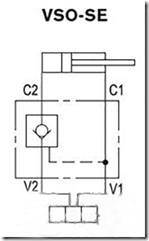 一種可調節閥允許液流單向流動(V2至C2),反向開啟則必須通過一個先導壓力控制實現,閥的開口大小與先導壓力成正比例,閥組包括一個單向閥,允許液流單向流動,溢流閥先導活塞由先導壓力控制,降低溢流閥設定壓力來控制反向液流。