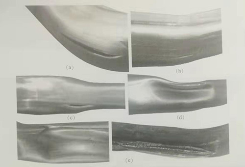 (a)彎曲段開裂;(b)過波區開裂;(c)焊縫開裂;(d)死皺;(e)飛邊。