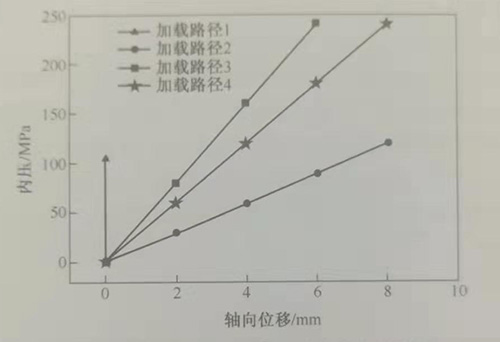 加載曲線對開裂的影響是非常大的。采用圖3-19所示的四種加載路徑研究了軸向進給對正方形截面構件內高壓成形的影響,其中加載路徑1、2成形壓力相同,加載路徑1為無軸向進給的情況:加載路徑3、4內壓相同,軸向進給不同。
