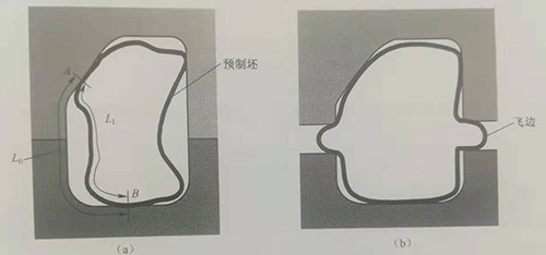 飛邊產生的主要原因是當零件某處截面形狀特殊,而預制坯截面形狀和內高壓成形模具分模面設計不合理,造成管材的一部分與模具先接觸的管材在模具閉合前被擠壓出分模面而形成飛邊,如圖3-21(b)所示。