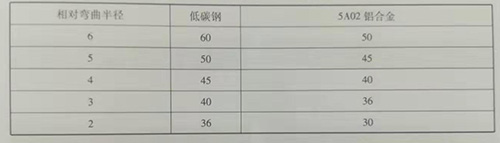 管材充液壓彎的極限徑厚比除了與材料有關外,還與彎曲半徑有關。不同彎曲半徑下,低碳鋼和鋁合金管材充液壓彎可達到的極限徑厚比如表3-4所示,極限徑厚比隨彎曲半徑減小面逐漸減小,當相對彎曲半徑為2-3時,低碳鋼和鋁合金管件的極限徑厚比不超過40。
