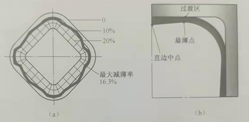 過渡區減薄最大是正方形和矩形截面內高壓成形壁厚分布的一個突出特點(圖3-22(b),當膨脹量為3.5%,由于沒有軸向補料,可以認為處于平面應變條件下,理論講平均壁厚減薄率等于膨脹量,但過渡區最大減薄率為16.3%,約為平均壁厚減薄率或膨脹量的4.6倍。