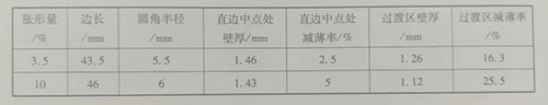 膨脹率是影響壁厚分布的主要因素之一。表3-6所列為不同膨脹率的壁厚變化值。隨著膨脹率的增加,直邊中心處壁厚變化不大,而過渡區減薄嚴重。當膨脹率為10%時,中點處壁厚為1.43mm,減薄率為5%;過渡區壁厚為1.12mm,減薄率達到了25.5%,容易引起過渡區開裂。
