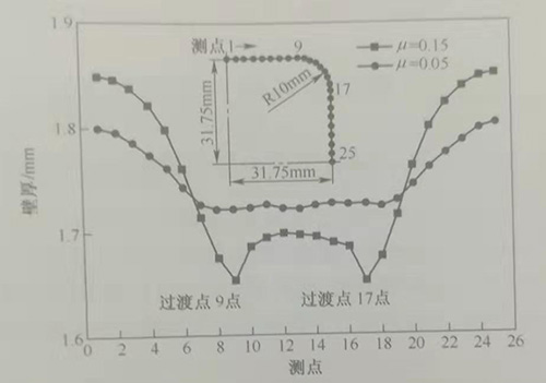 摩擦對壁厚分布也有著重要的影響,對于矩形截面的內高壓成形,隨著摩擦的增加,壁厚不均勻性增加,摩擦越大,壁厚不均勻性也越大,過渡區減薄越嚴重,如圖3-23所示。