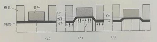 (4)多個套環(huán)一次整體裝配,一致性好,效率高。采用液體作為傳力介質(zhì)可在軸管內(nèi)壁各部位產(chǎn)生相同的脹形力,一次增壓可同時將多個套環(huán)連接到軸管上;
