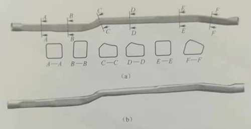 ②沿軸線具有多個(gè)不同的多邊形截面,包括矩形、平行四邊形、五邊形及異型截面等,由于各個(gè)截面之間的過(guò)渡形狀復(fù)雜,給預(yù)成形帶來(lái)很大的困難;