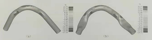 管材經過彎曲后其最大減薄率為15.8%,位于第D-D截面外側,最大增厚率為17.4%,位于D-D截面的內側。內高壓成形后,最大減薄率為20.2%,位于F-F截面外側;最大增厚率為15.7%,位于D-D截面內側,如圖3-58所示。