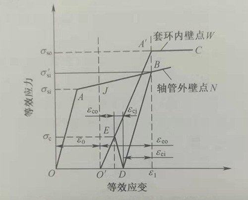 再結合圖7-3來看,當軸管和套環材質已經確定并滿足液力脹接條件后,隨著軸管和套環初始間隙δ的增大,曲線O’A’C右移,則點B也右移,軸管應變硬化后的流動應力值σ’si也將增大,使脹后軸管的彈性回復量εei增大,于是(εeo-εei)減小。上述分析表明,在保證軸管完全進入塑性變形的前提下,初始間隙越小越有利于提高脹接強度。