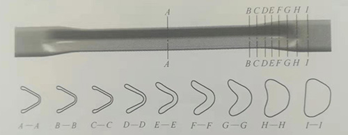 圖3-70為扭力梁三維圖及典型截面形狀。管件為V形截面結構,沿軸線方向截面變化復雜,截面周長變化大。沿軸線方向分析截面的寬度變化,從端部到中間截面形狀變化,截面最大寬度為120mm,位于端部區域(I-I截面),最小寬度為90mm,位于中間區域(A-A截面)。管坯材料為先進高強鋼,抗拉強度σb=780MPa,硬化指數n=0.10,強度系數K=1050MPa。