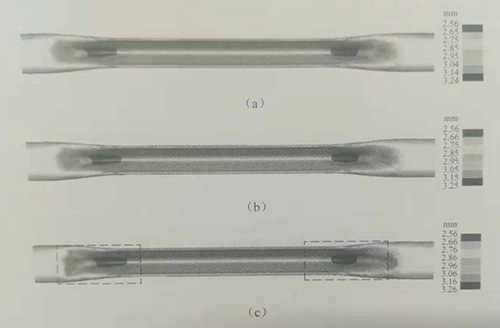 軸向補料量對扭力梁內高壓成形件的厚度分布和成形精度有著重要的影響。圖3-72分別給出了內高壓成形過程中相對補料量(軸向補料量和零件長度的之比)分別為4%、8%和12%時扭力梁壁厚分布的數值模擬結果。