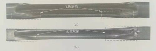 當預制坯形狀不合理時,合模過程中在管件中間V型截面和端部截面的過渡區域會出現飛邊缺陷,如圖3-73(a)所示。而在內高壓成形過程中,當軸向進給大于8%時,在端部過渡區域會出現起皺缺陷,即使采用很高的整形壓力皺紋也難以消除,如圖3-73(b)所示。只有當采用合理的預制坯形狀和合適的加載路徑時,才能成形出合格的扭力梁內高壓成形件,如圖3-74所示。