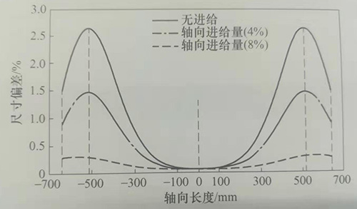 軸向進給可以顯著改善零件的尺寸精度,圖3-75給出了扭力梁內高壓成形件尺寸精度測量結果。當沒有軸向進給時,最大尺寸偏差為2.7%,位于端部位置;當軸向補料量為4%時,最大尺寸偏差降低到1.5%;而當軸向進給增加到8%時,整個扭力梁的尺寸偏差在0.5%以內,滿足設計要求。