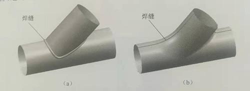 薄壁三通管的傳統(tǒng)制造工藝主要有兩種:一種是兩個直管的插焊結(jié)構(gòu);另種是利用板料沖壓成兩個半管后再焊接成整管,如圖4-2所示。