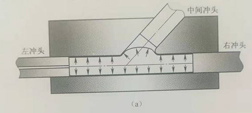 以管材為坯料通過內(nèi)高壓成形可以直接加工出整體結(jié)構(gòu)的多通管。下面以Y形三通管為例,說明多通管內(nèi)高壓成形基本工藝過程(圖4-3)。