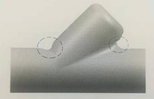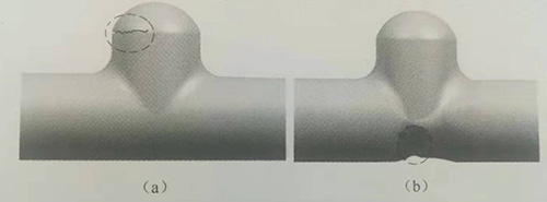 多通管內高壓成形過程中,由于內壓、左右兩端軸向進給量及中間沖頭后退量匹配的不合理,會出現不同的缺陷形式。T形三通管內高壓成形的主要缺陷形式有支管頂部破裂、主管起皺,如圖4-5所示;而Y形三通管由于結構的不對稱性還會出現支管過渡區內凹的缺陷,如圖4-6所示。