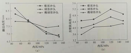 隨著內(nèi)壓增加,當(dāng)內(nèi)壓為80MPa時(shí),三種沖頭的翻邊總高度相差不大,但錐形沖頭的直壁段高度大于后兩者。