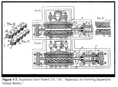 利用流體壓力形成管狀金屬零件的應用可追溯到20世紀初。一項專利(Park?1903)圖1-7描述了一種用于建造蒸汽鍋爐的蛇形空心體的裝置,這個蛇形的構件是由一個小管構成的。