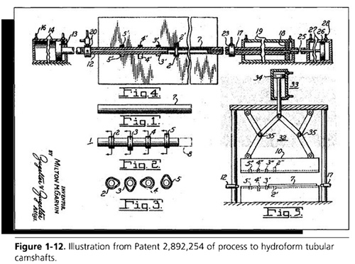 根據這項專利,圖1-8,確定了管內高壓成形過程的主要元素,顯示了放置在下刀具腔中的預成形的可導電金屬管和流體密封方法。專利“減少手工加工和廢料,改善形狀和尺寸的均勻性”定義了該工藝的優點。