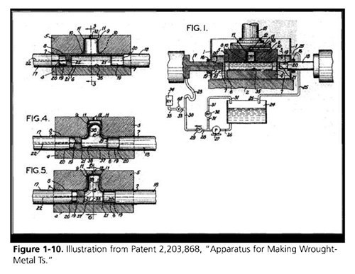 1940年的專利(Gray?1940),如圖1-10所示,描述了制造鍛制金屬T形配件的裝置。它詳細說明了在較低的壓力下材料的軸向進給,然后將壓力增加到最終成形的最大值。
