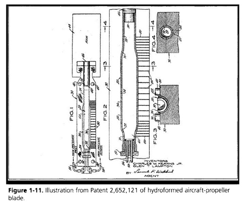 1950年的一項專利(Kearns?1950),如圖1-11所示,用于生產空心金屬飛機螺旋槳葉片。葉片芯的可變截面是通過使用高流體壓力膨脹管坯而形成的。液壓成形的結構方法在降低葉片重量的同時增加了剛度。