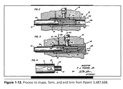 1970年專利(Fuchs?1970),如圖1-13所示,描述了成形和形成物品的方法。本專利涵蓋的方法和裝置說明了通過高壓進行的擠鍛(端部直徑減小)、直徑膨脹的軸向進給、槽的穿孔和模內端部剪切。