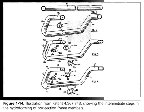 1986年,加拿大伍德斯托克的加拿大標準管(現在銅焊單位),一家生產管子和管材的公司,獲得了北美第一項將液壓成形技術應用于大型框架構件的專利(Cudini?1986),如圖1-14所示。標準管被稱為工藝變型管,該公司的部門成為現在眾所周知的液壓成形公司,變型標準管開發了這些技術,作為他們在管材方面的工作。