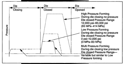 高壓液壓成形中的壓力范圍一般為12000磅/平方英寸(83兆帕)到60000磅/平方英寸(414兆帕)。高壓力允許液壓成形的管段長度膨脹到材料塑性伸長允許的極限。任何表面變形或褶皺,可能發生在閥門關閉期間,用更大的壓力。